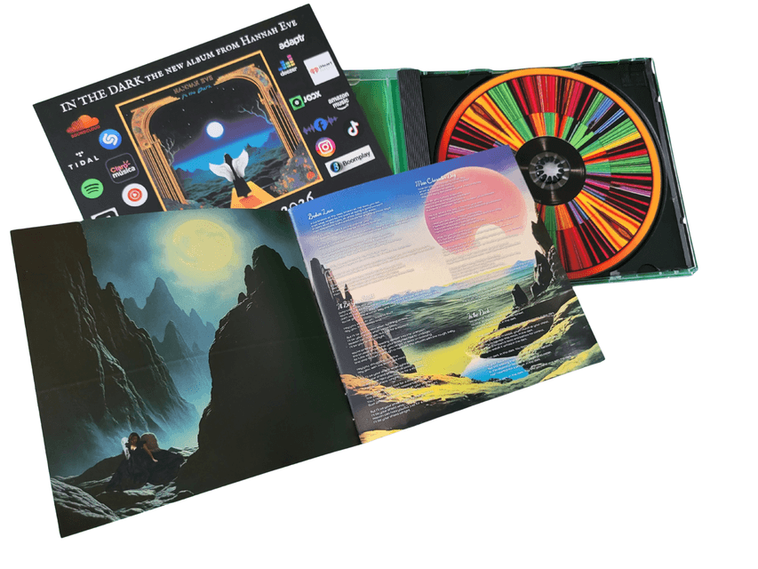 Album and EP combo deal: Hannah Eve's 11 track album, 'In the Dark' includes an 8-page booklet with lyrics. Track Listing: 1. Broken Laws 2. I'll Be Your Shield 3. Main Character Day 4. In the Dark 5. Unknown Demon 6. Dr Apathetic 7. Hope 8. My World Just Got Small 9. Coming Home 10. It's Been a Year! 11. The Pernicious Effect Hannah Eve's 6 track EP 'Time' includes a 4-page booklet with lyrics: Track Listing: 1. Radiate To Me 2. No Filter 3. Meta For The Masses 4. Time 5. The Girl I Fell Into 6. Quiet Actions